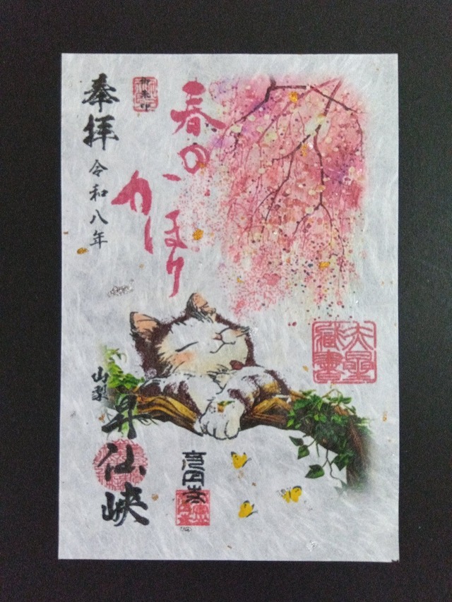 お待たせしました~ 恒例の《春をかほる》バージョン御朱印の令和八年版ができました 今年は猫ちゃんとうさぎさんとお馬さんの3種類になります。 もちろん前作人気の龍神さまと旧猫さんバージョンもそのまま残ってますよ。機会を逃した方はぜひともチャンスですよ。 桜の匂いの微粒子が・・・さんの鼻に吸い込まれて… まさにアート御朱印ならではのポップで旬な作品になりました 待ち遠しい春の御朱印帳の一枚にいかがですか ご注文の際は5種類からご選択をお願いします サイズ100×150mmはがきサイズ 和紙は金銀箔入りの雲龍柄越前和紙です 日付は入りません 日付の必要な方は必ずご一報ください